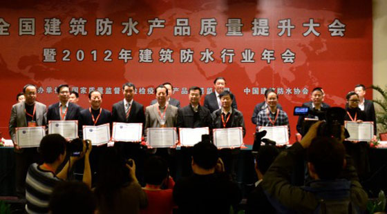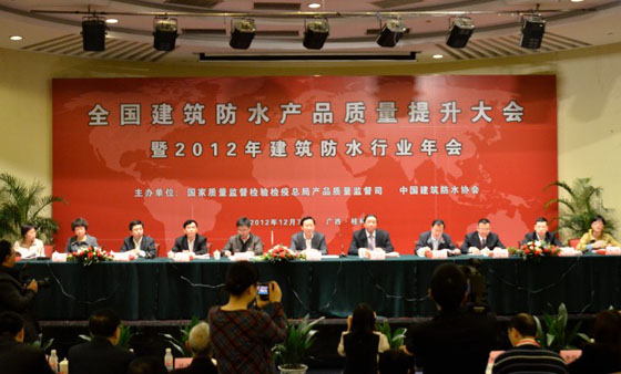 2012年12月7日,全國建筑防水產(chǎn)品質(zhì)量提升大會在桂林召開。此次會議由國家質(zhì)量監(jiān)督檢驗(yàn)檢疫總局、中國建筑防水協(xié)會主辦,來自25個(gè)?。ㄗ灾螀^(qū)、直轄市)質(zhì)監(jiān)部門和生產(chǎn)許可管理部門的負(fù)責(zé)人,以及全國建筑防水行業(yè)骨干企業(yè)的負(fù)責(zé)人,共計(jì)450多人出席會議。